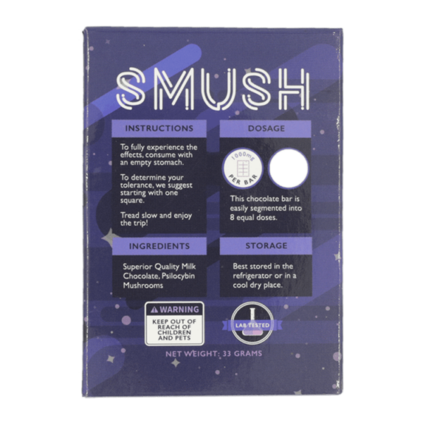 SMUSH chocolate bars come in lab precise dose segments to help you reach your desired trip experience level. One segment will be adequate for a micro-dose and five for full blown trip experience into SMUSH multiverse.